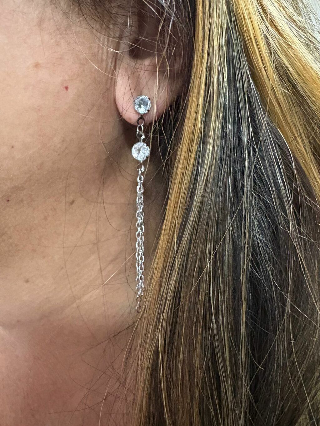 Esse brinco é confeccionado em aço inox prateado, com dois pontos de luz em zircônia e finalização em correntes delicadas. Ideal para looks elegantes e noturnos, trazendo movimento e brilho ao visual.