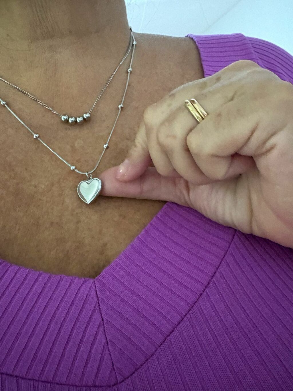 Encante-se com a sofisticação do nosso colar duplo em aço inoxidável, uma peça atemporal que une delicadeza e modernidade. Com design harmonioso, suas duas camadas criam um efeito elegante e refinado: a corrente menor, de 41 cm, exibe sutis esferas metálicas, enquanto a maior, de 45 cm, destaca um deslumbrante pingente de coração. Para um ajuste perfeito, a peça conta ainda com uma extensão de 5cm.