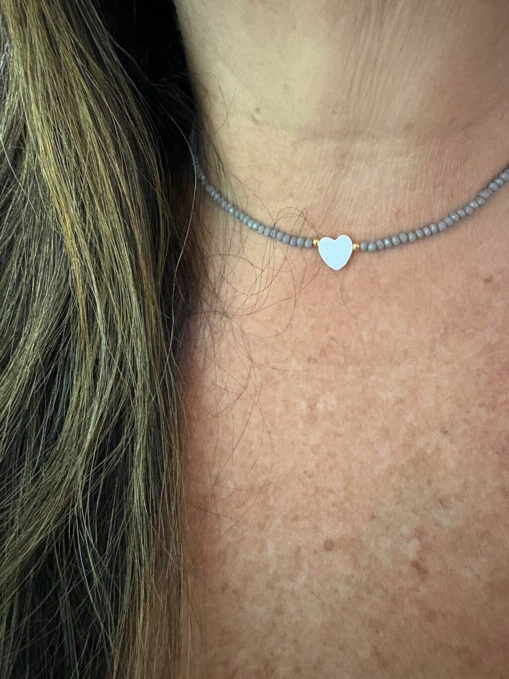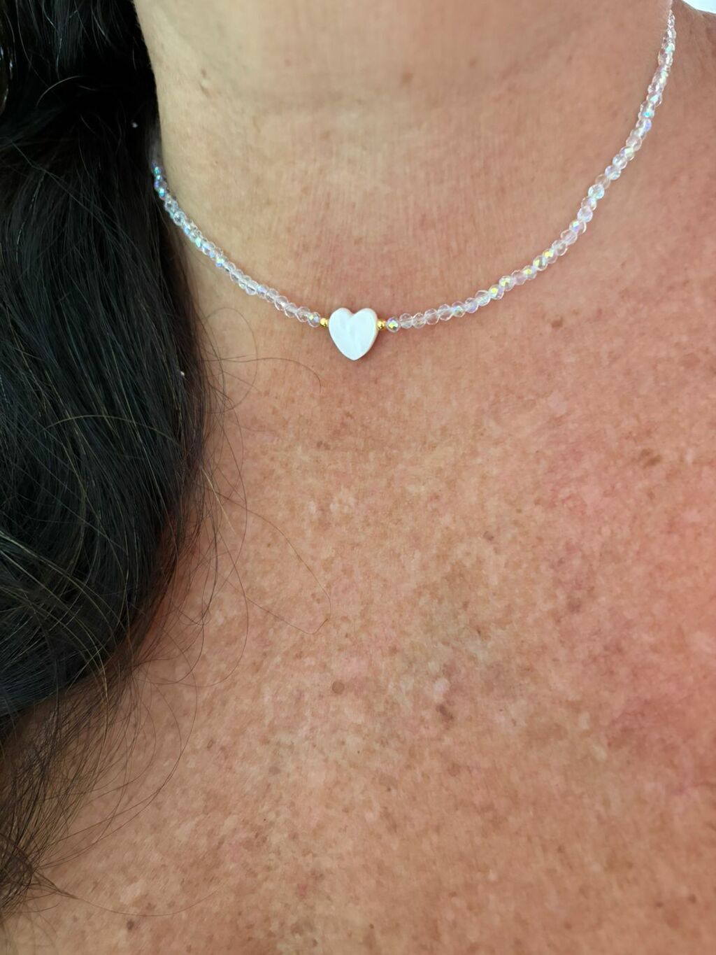Delicadeza que encanta colar de cristais de vidro com pingente de coração de madrepérola. Um toque de brilho e amor para seu look.