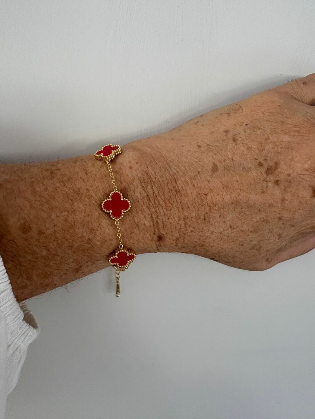A pulseira Trevo é feita em aço inoxidável com banho dourado, trazendo 5 pingentes de trevo de quatro folhas – símbolo de sorte e proteção – em cores vibrantes para realçar o seu visual com charme e leveza.